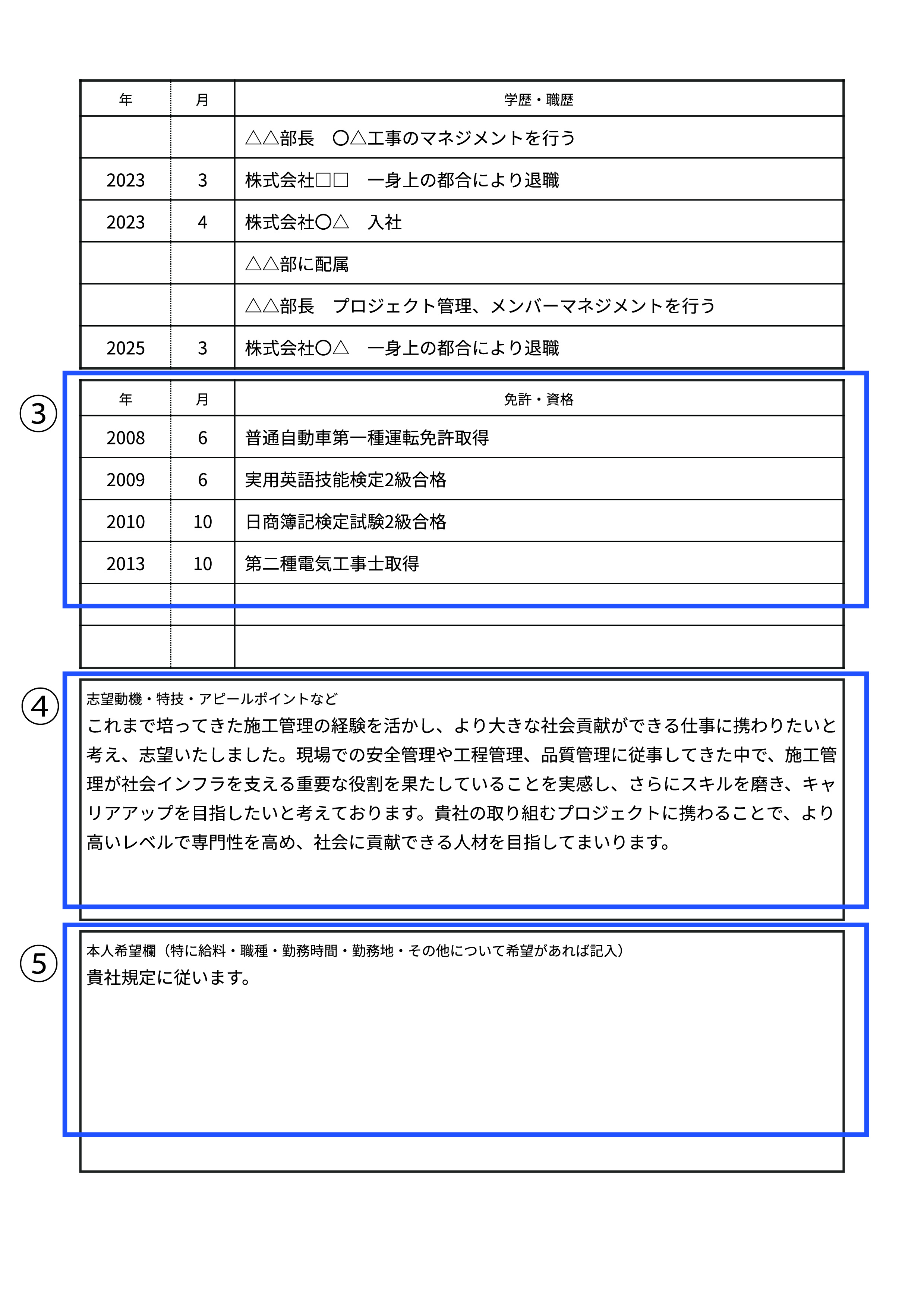 経験者の場合は、これまでにどのような現場で、どのような業務を担当してきたかという「実績」が最大のアピールポイントになります。即戦力として期待されるため、保有資格や得意な施工内容を具体的に示し、転職後にどのように会社に貢献できるかをイメージさせることが重要です。