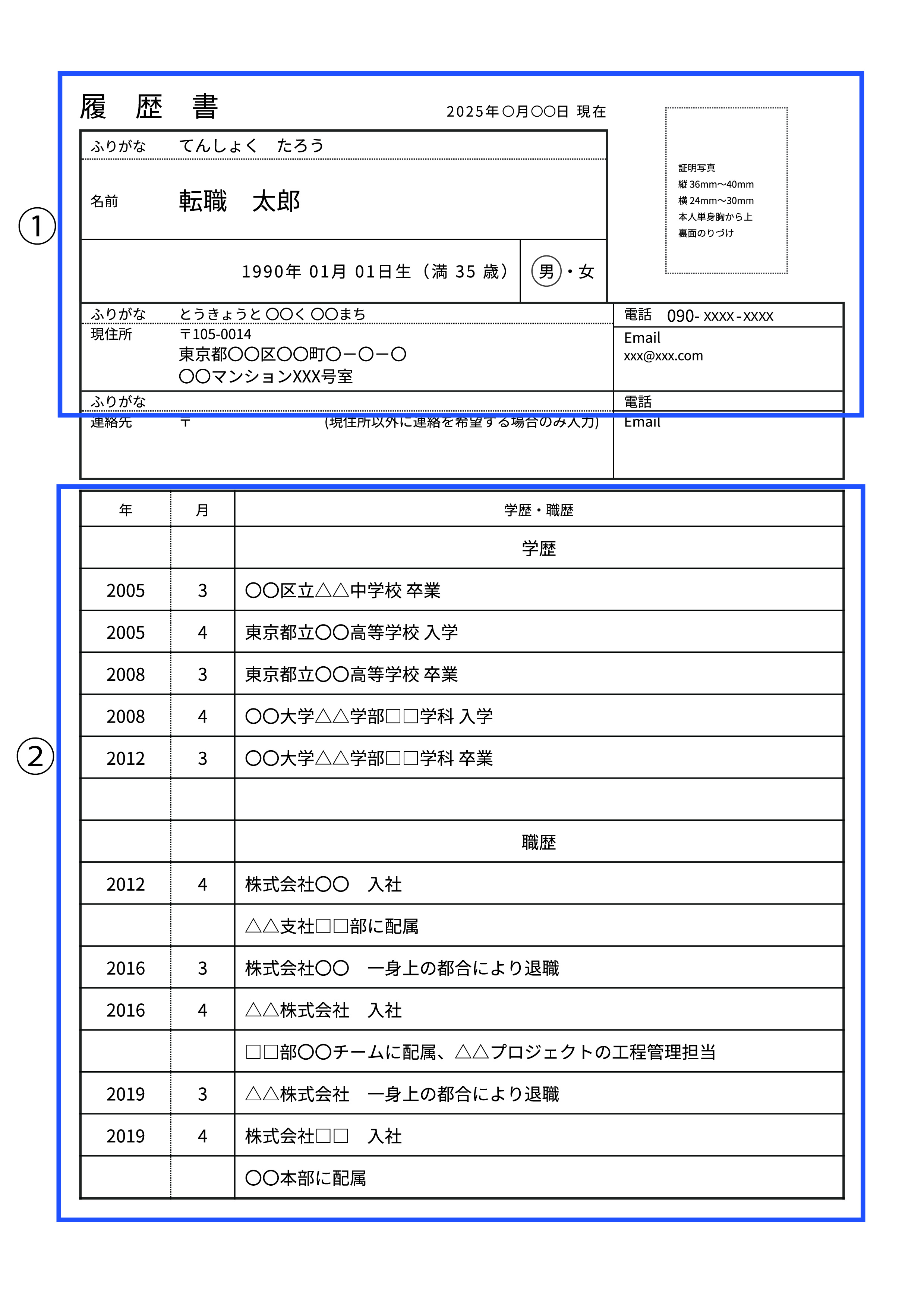 明確な決まりはありませんが、中学校卒業以降の学歴を書くのが一般的です。入学・卒業年とともに記入します。学校名は正式名称で、学部・学科名も省略せずに記載しましょう。 - 職歴